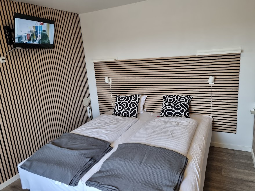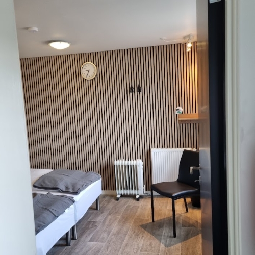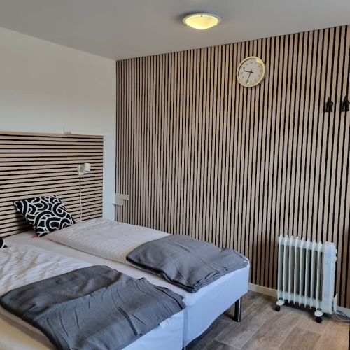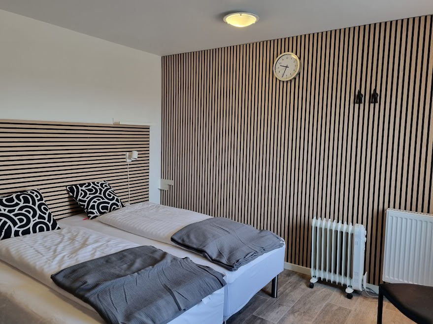 Et værelse med stor dobbeltseng, 1 stk enkelt seng, 1 værelse med 2 stk. enkeltsenge.